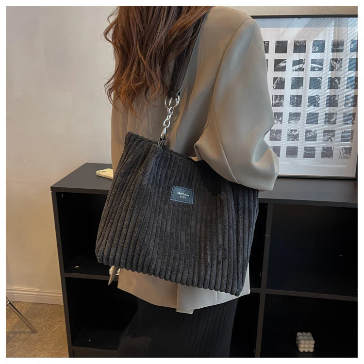 Der gerippte Stoff verleiht der Tasche einen einzigartigen Look, während die braunen Schulterriemen mit Kettendetails einen Hauch von Eleganz verleihen.